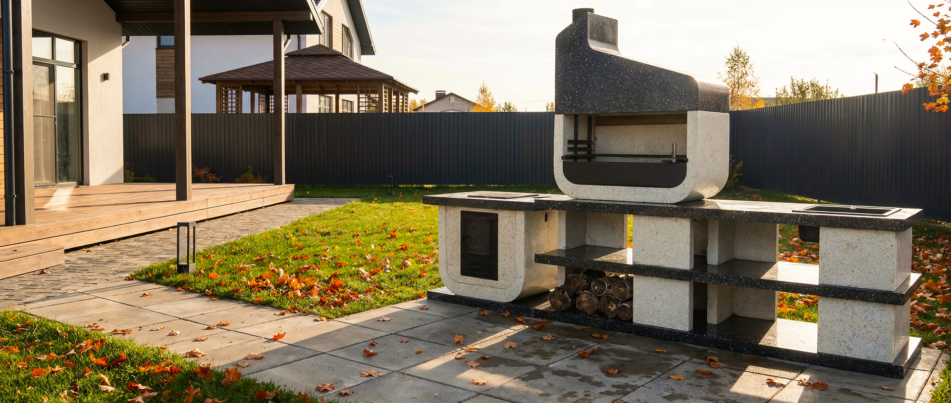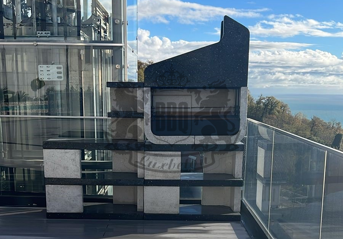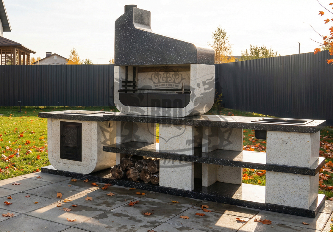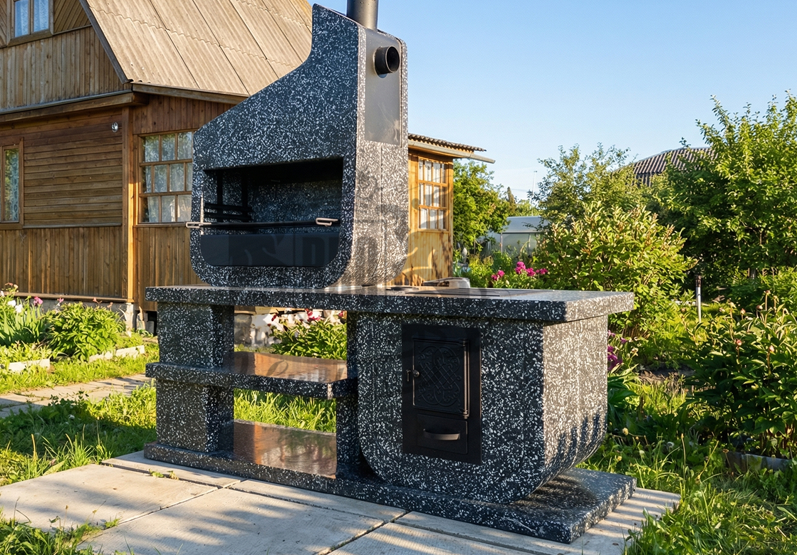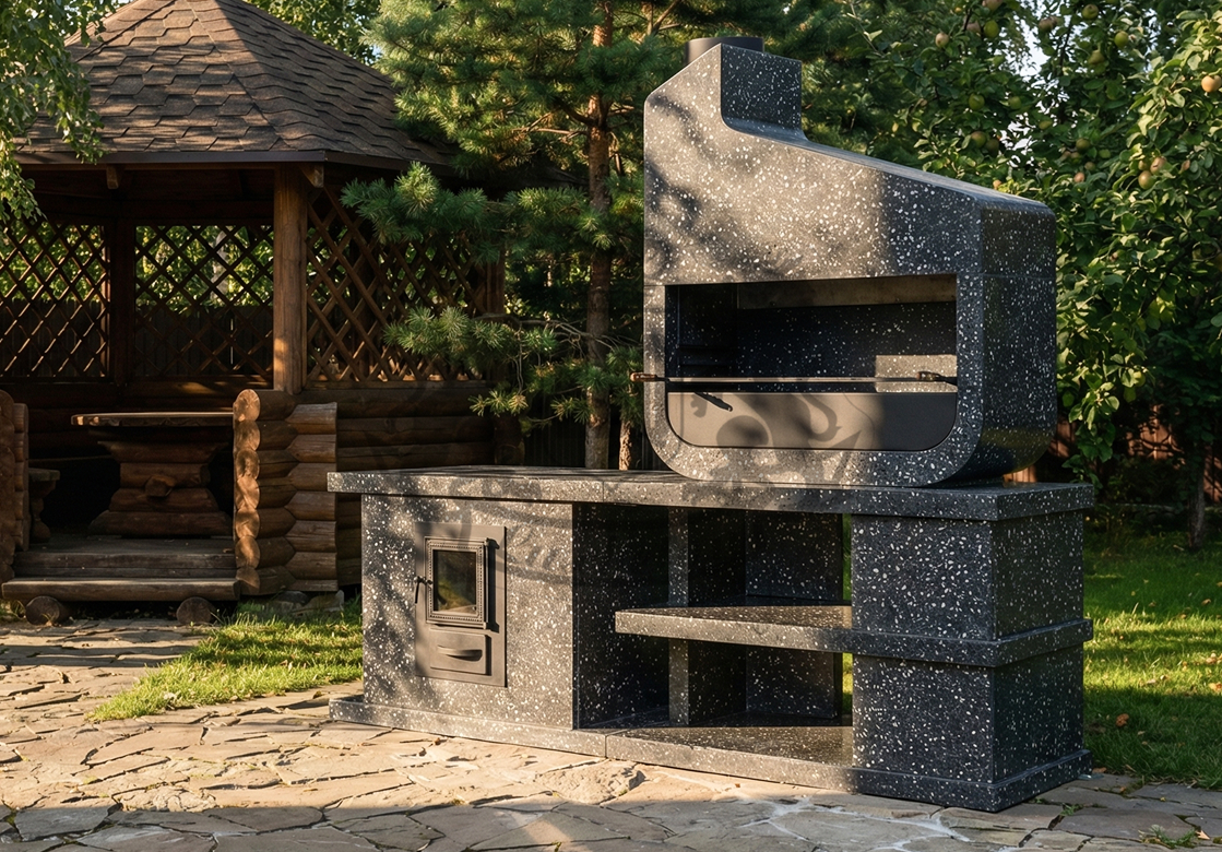 Дымосборник из металла 2 мм с жаропрочной краской, столешница не впитывает загрязнения и жир. Возможна установка дополнительных модулей: коптильня, тандыр, гриль для шампуров. Вес модулей 70–100 кг обеспечивает устойчивость. Монтаж проводится на ровную площадку — достаточно двух человек и пары часов времени.